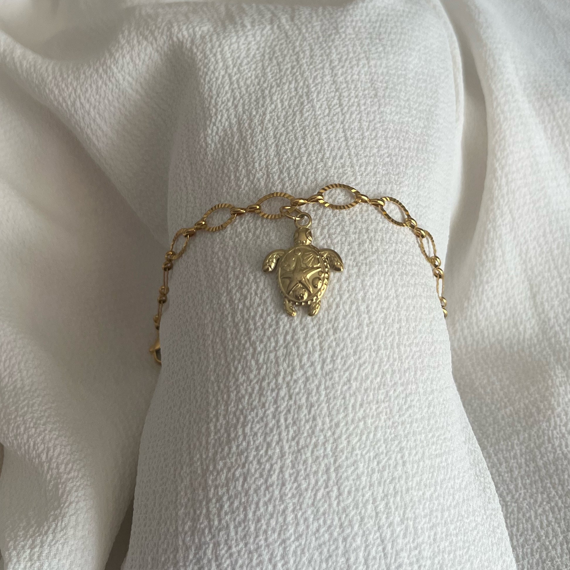 Le bracelet reprend le symbole de la tortue , avec un sur la carapace. Léger, discret, et porteur de sagesse.